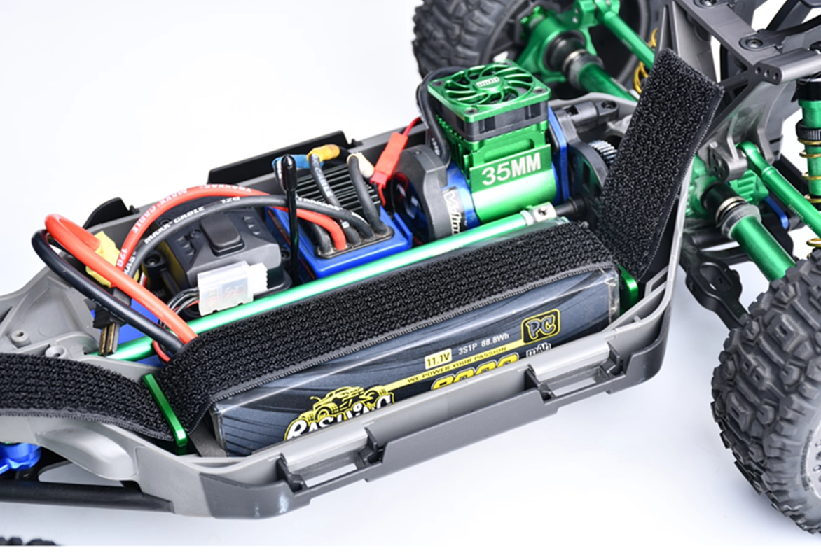 (2) Features adjustable battery straps for flexible battery retention, compatible with high-capacity batteries